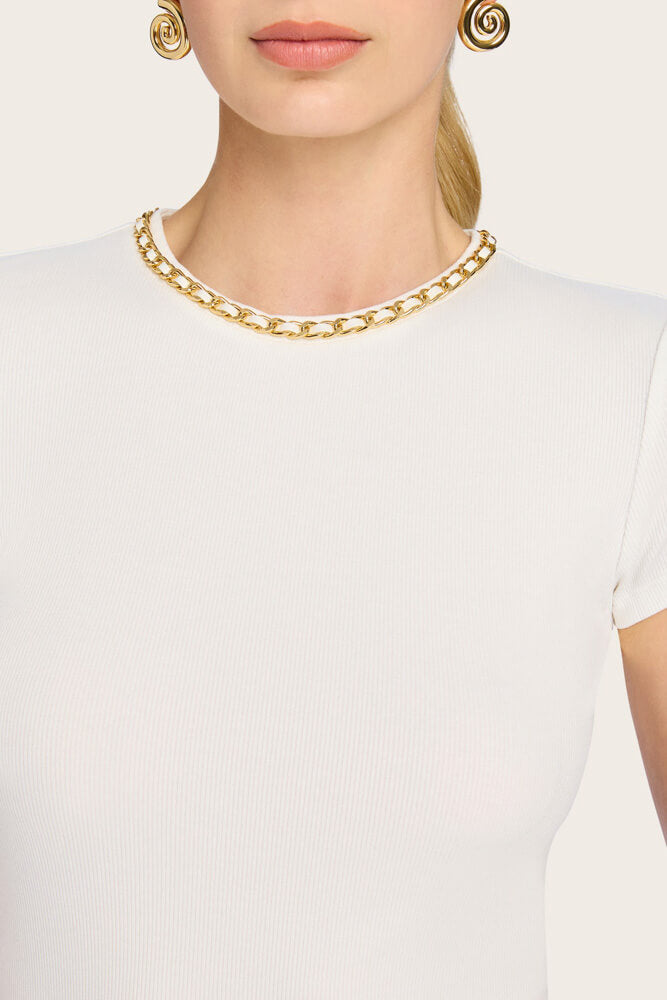 - Gold-tone chain interwoven with leather detail around neckline