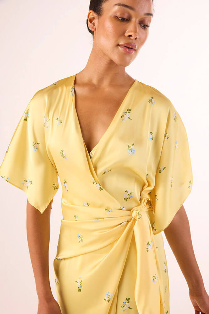 - Elbow-length kimono sleeves with subtle underarm splits