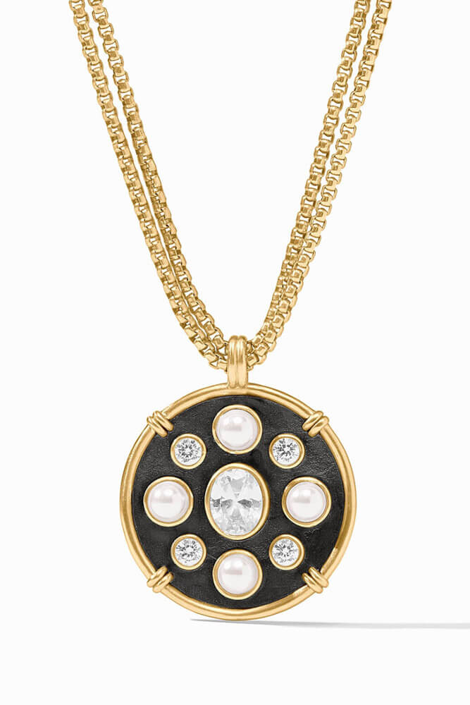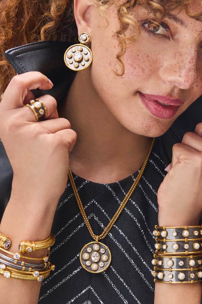 All Julie Vos jewels begin with traditional lost wax casting using nickel-free brass, which is then hand-worked with time-honored techniques including hand-hammering, soldering, stone setting, and polishing before being plated with warm 24K gold and sealed for durability. We source pearl and mother of pearl that meet exacting standards for shape, surface quality, and lustre, and our imported glass gemstones are selected for color, clarity, and brilliance. Julie stands behind the quality and longevity of each design with an exceptional warranty and an unparalleled commitment to customer service.